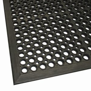 The versatile ring mat is a specially designed anti slip construction with large cylindrical holes. Ideal for wet areas and workstations. The underside is constructed with a pincushion effect that allows water and spills to pass through and quickly away from the mat promoting a safe dry traction surface.