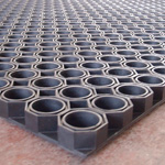 Ring mats have a specially designed anti slip construction with large cylindrical holes and the underside is constructed with a pincushion effect that allows spills to pass through and quickly away from the mat promoting safe, dry traction. The mats have 4 square edges.